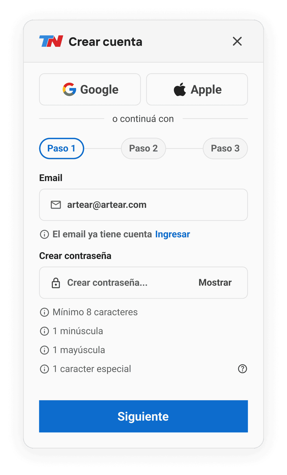 Un medio internacional utiliza un input que detecta si el email tiene o no una cuenta creada y en base a eso te lleva al flujo de inicio de sesión o al de crear una cuenta.