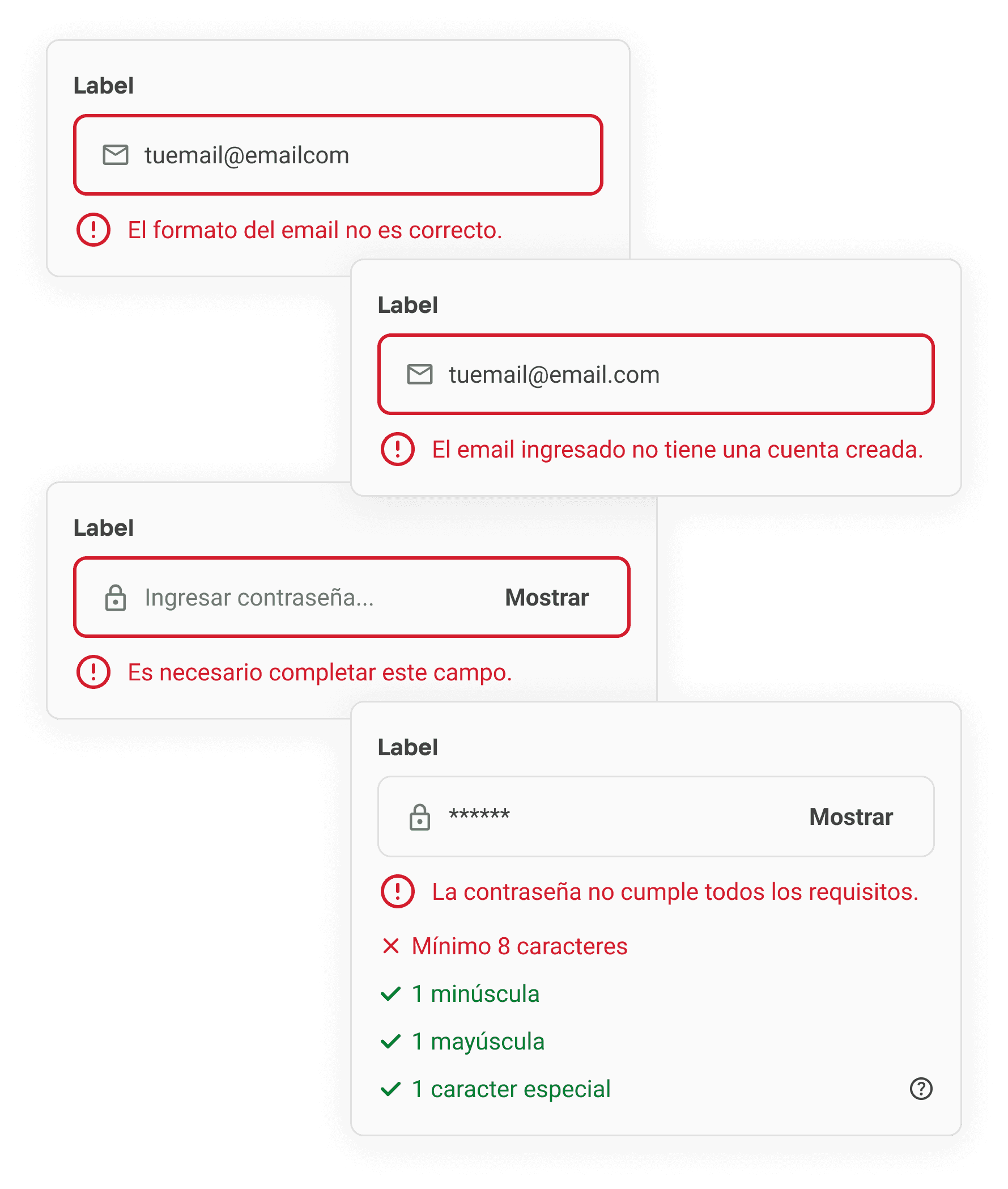 Diseñamos los estados de error para que sean explícitos y accesibles, evitando mensajes genéricos. Cada input tiene su label asociado, iconografía y un texto que explica exactamente qué está pasando.