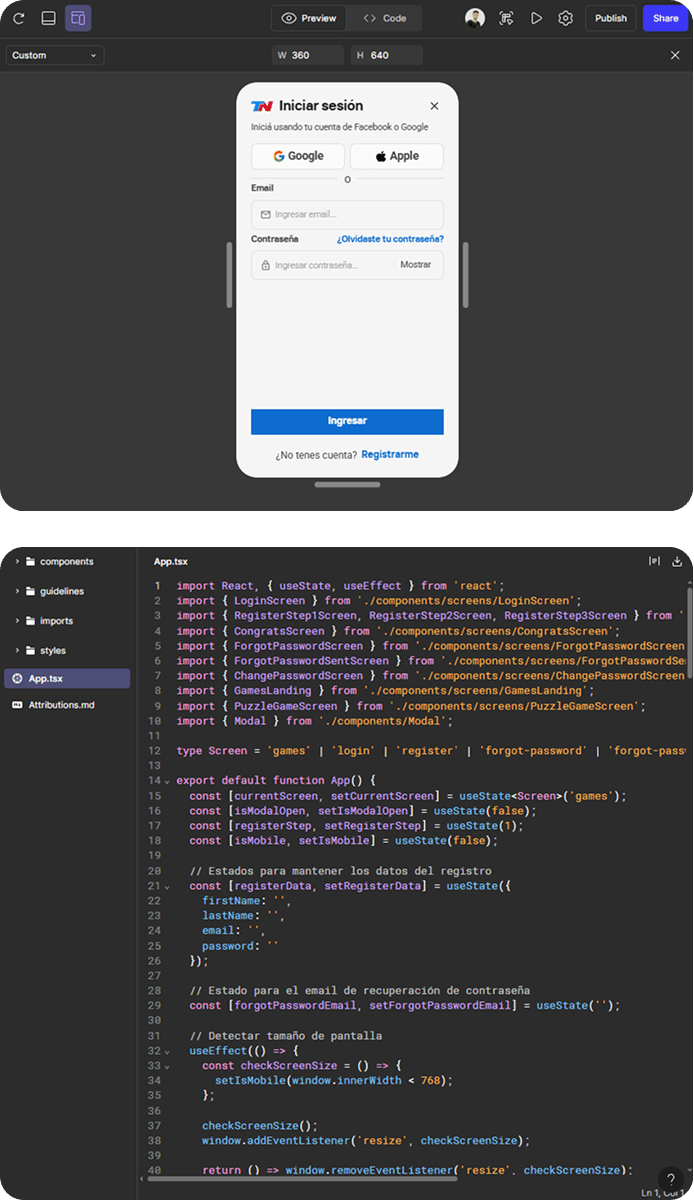 Dado que el diseño de cada pantalla fue armado con componentes reutilizables, autolayouts e instrucciones claras, el proceso de importar las vistas hizo que el resultado en Figma Make sea prácticamente igual al diseño planteado.