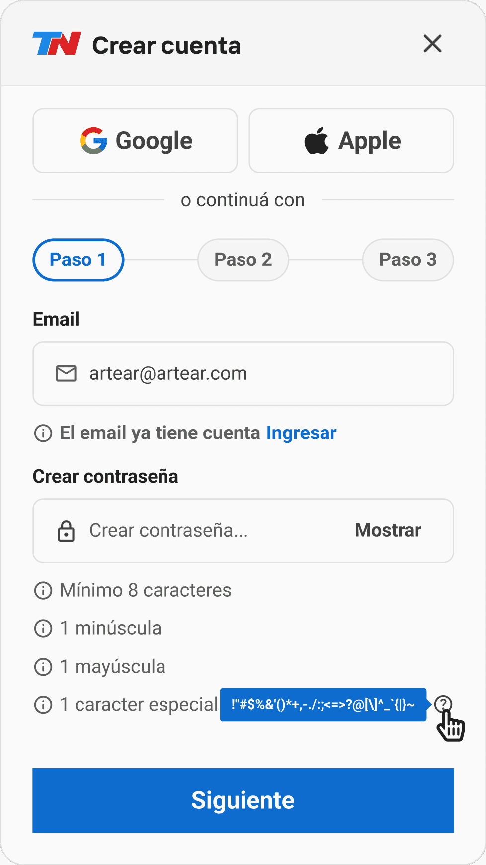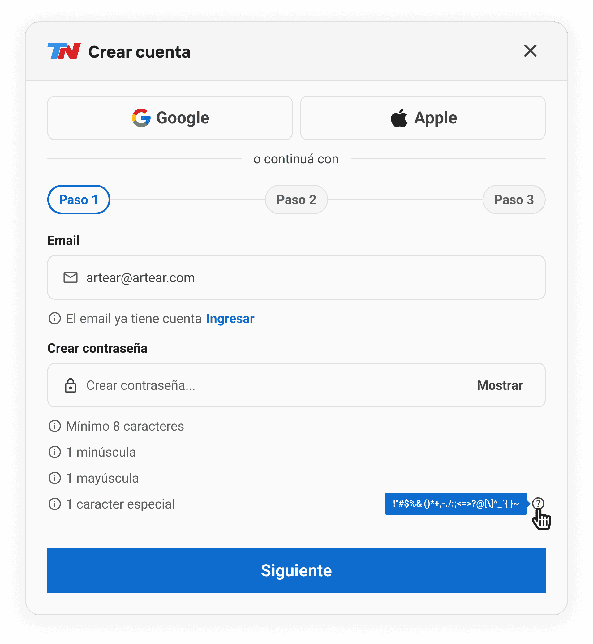 Integramos en el diseño un icono de ayuda que al hacerle hover o tap muestre un tooltip con todos los caracteres disponibles para la creación de la contraseña.