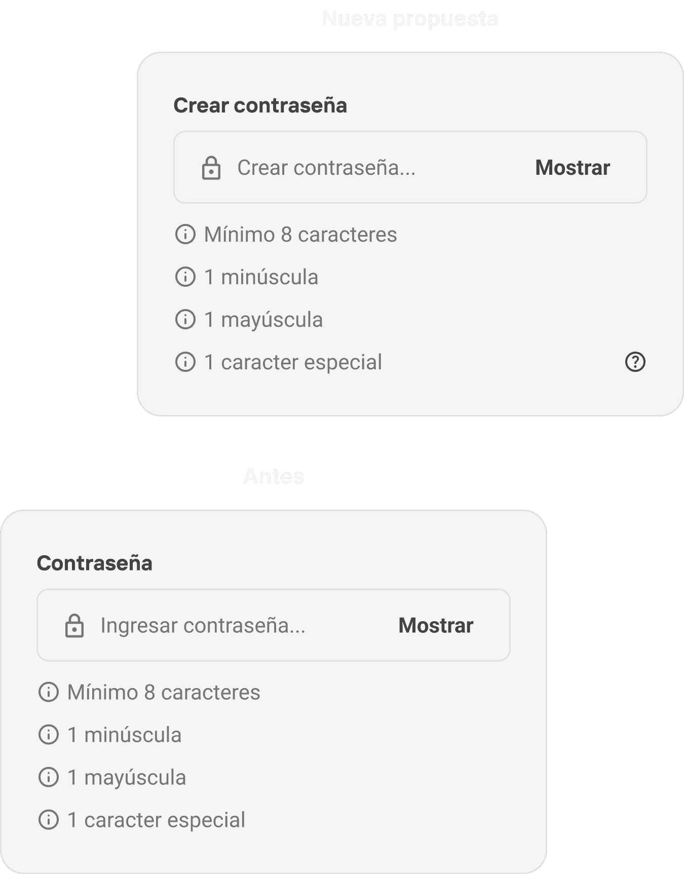 Mejoramos la información de requisitos para crear contraseña, con validación en tiempo real.