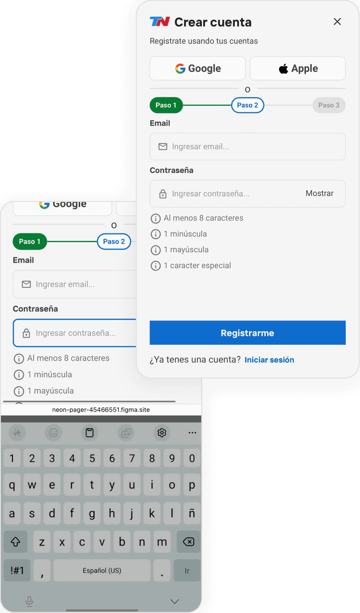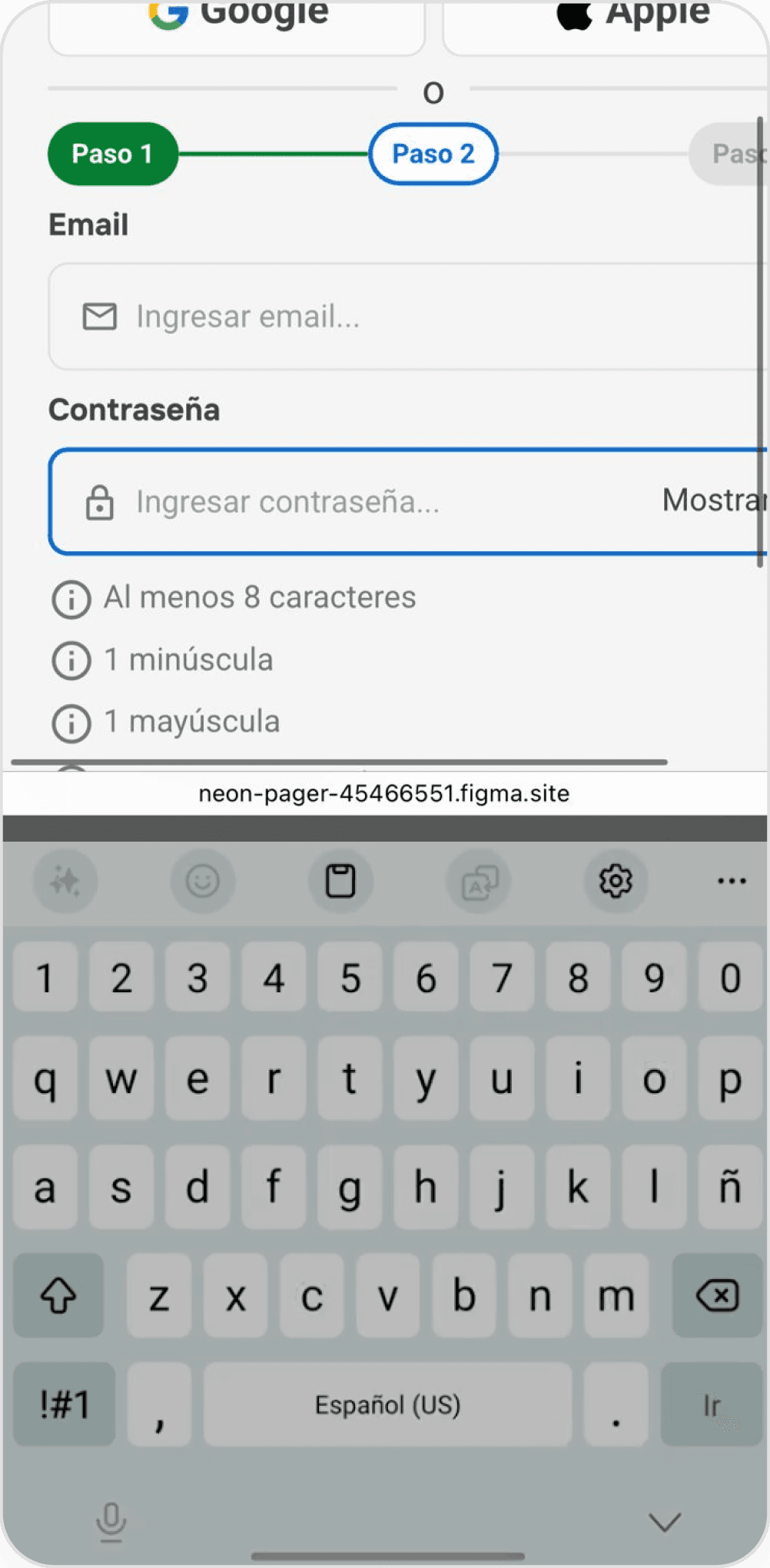 Construimos un prototipo de alta fidelidad que replica la lógica real del login/registro: validaciones de campos, requisitos de contraseña, estados de error y avance por pasos.